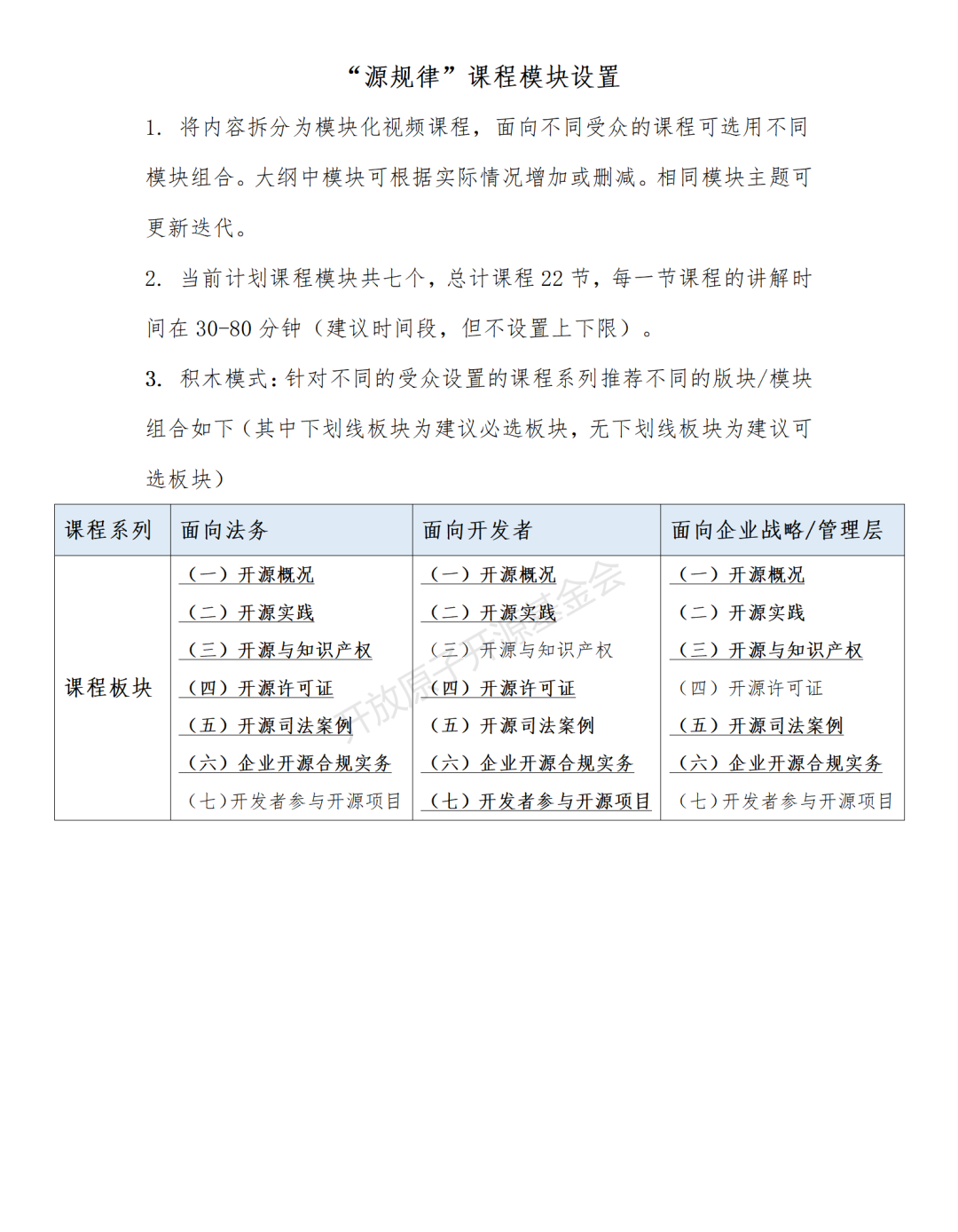 “源规律”将内容拆分为模块化视频课程,面向不同受众的课程可选用不同模块。当前“源规律”系列课程预计共七个模块,总计课程 22 节。与会嘉宾就“源规律”开源系列课程共建计划十分支持,并积极确认参与共建的“源规律”课程模块。了解“源规律”更多详情,请参见:
