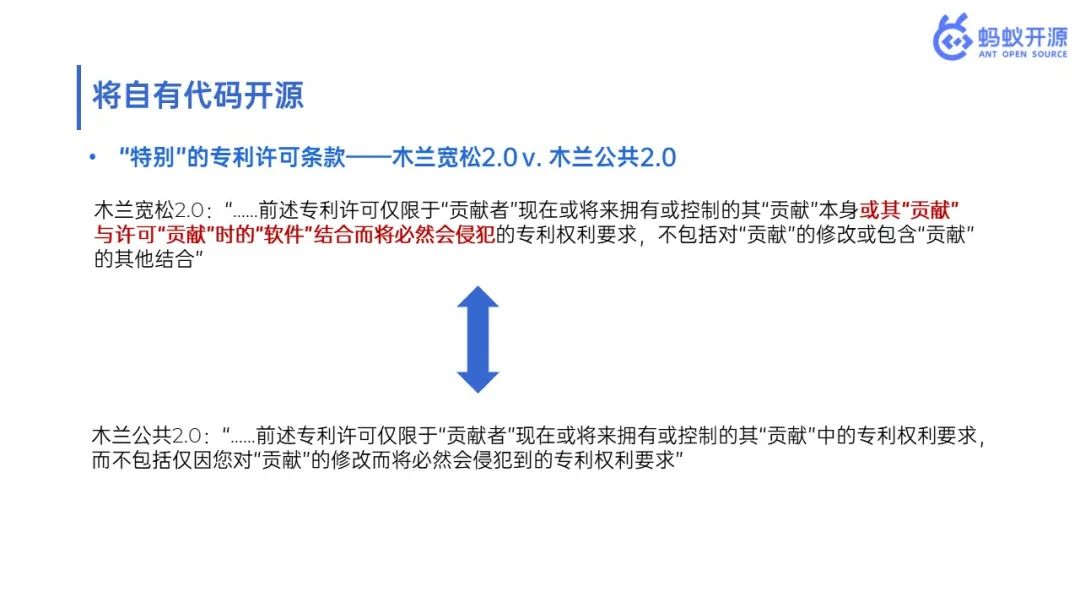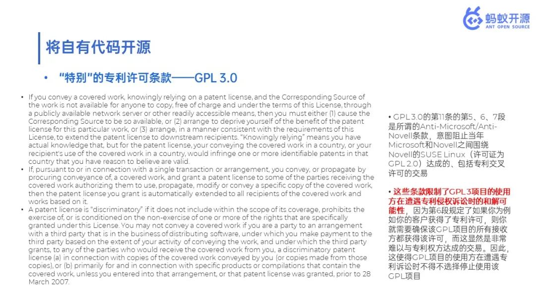 (3)“特别”的专利许可条款:胡律师首先对比了木兰宽松2.0和木兰公共2.0许可证中对于专利许可的不同约定;然后又以GPL 3.0为例,介绍了GPL 3.0的第11条的第5、6、7段是所谓的Anti-Microsoft/Anti- Novell条款,意图阻止当年Microsoft和Novell之间围绕Novell的SUSE Linux(许可证为GPL 2.0)达成的、包括专利交叉许可的交易,胡律师指出这些条款限制了GPL 3.0项目的使用方在遭遇专利侵权诉讼时的和解可能性。