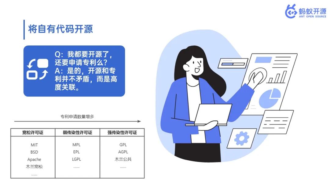 对于将自有代码开源,有开发者存在疑问——我都要开源了,还要申请专利么?对此,胡律师指出,将自有代码开源会增加被诉专利侵权的风险,但开源和专利并不矛盾,而是高度关联。胡律师指出开源许可证从宽松到弱传染性到强传染性的方向,专利申请数量也在不断增加。
