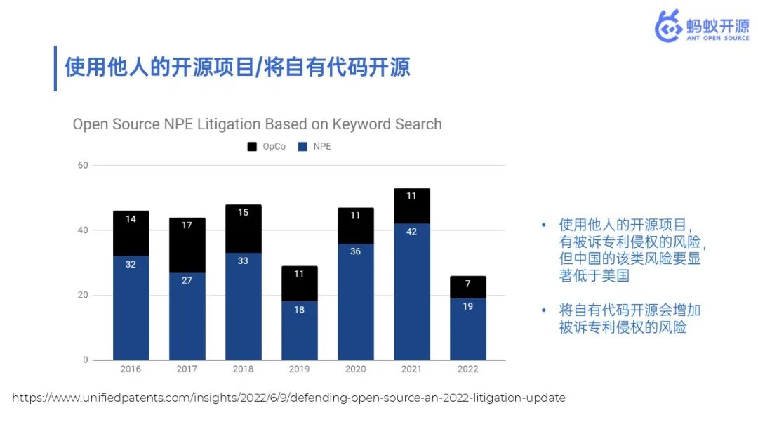 从实践角度出发,胡律师讲解了开源与专利的关系,指出使用他人的开源项目/将自有代码开源可能涉及一定的专利侵权风险。胡律师认为,尽管使用他人的开源项目有被诉专利侵权的风险,但从与开源有关的诉讼数据分析来看,中国发生这种风险的概率相对较低。
