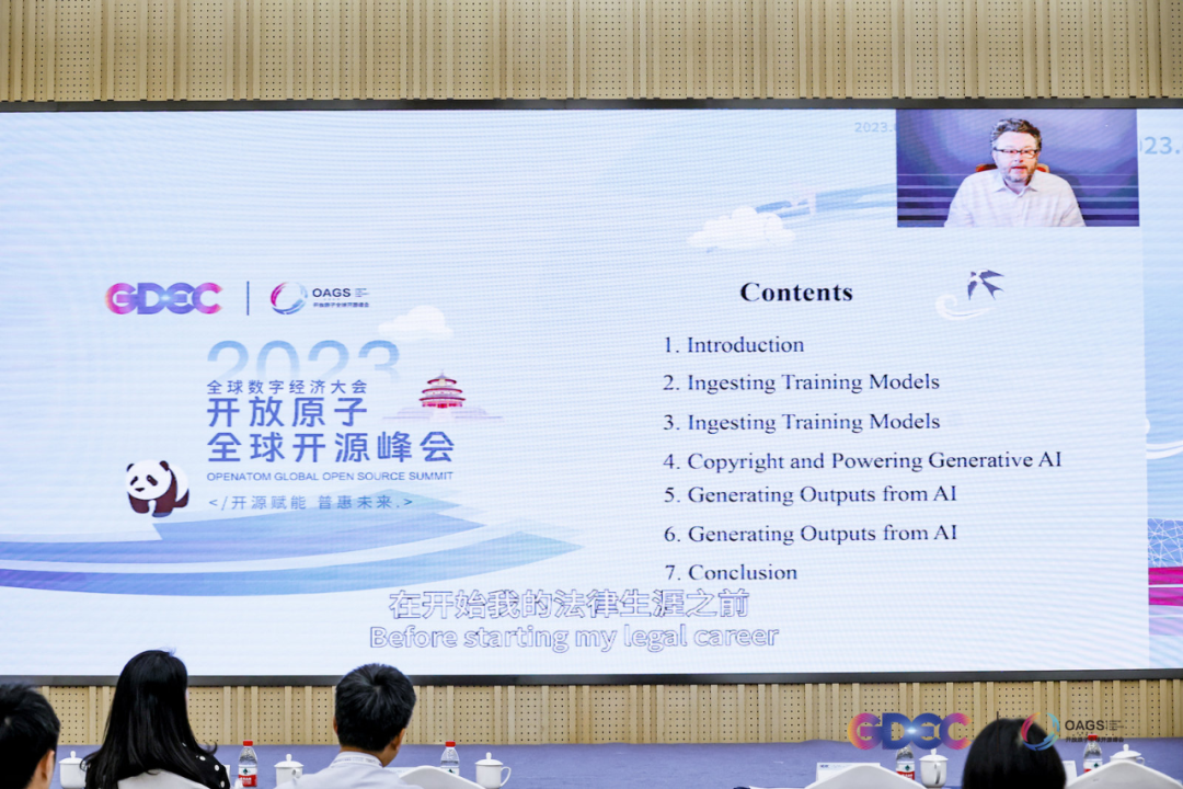 Andrew Katz律师 同样围绕人工智能解析了跨境时的法律与版权问题及开放许可下的语言模型发展。他认为,从版权的角度来看,一个生成式人工智能系统“提取训练素材”“使用人工智能模型来驱动生成式人工智能引擎”以及“从人工智能模型中生成输出物”这三点可以受到版权的约束。