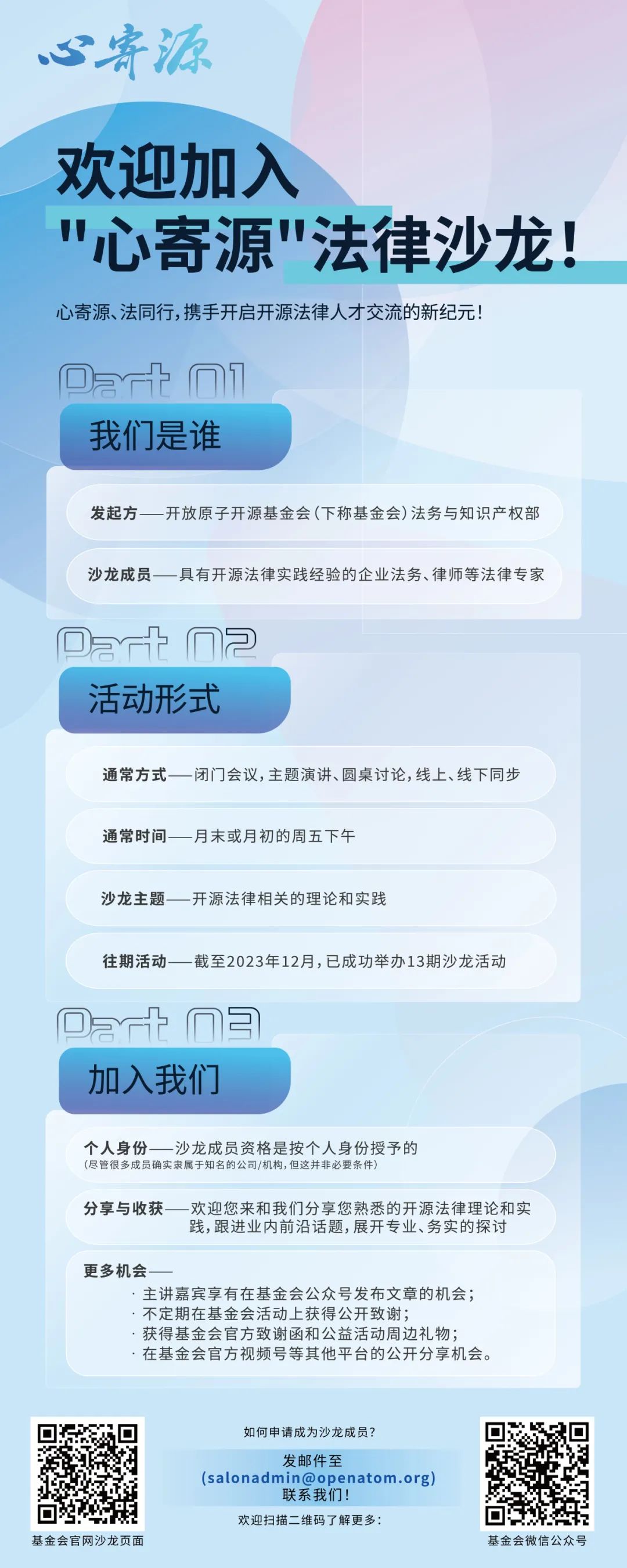 无论您是否为开源法律圈人士,只要对开源法律感兴趣,诚邀发邮件至salonadmin@openatom.org,告诉我们您感兴趣的话题、喜欢的主讲嘉宾。我们邀请您留下联系方式以便及时获取未来“心寄源”活动信息、成为沙龙受邀听众。