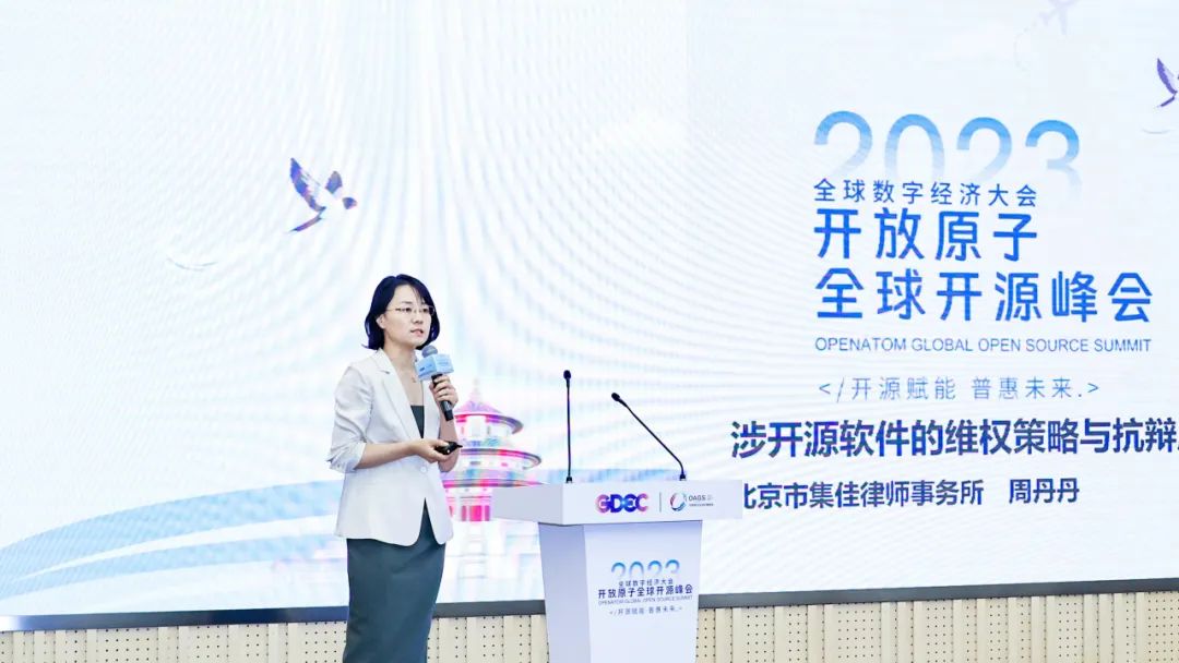 周丹丹律师以《涉开源软件的维权策略与抗辩应对》为题发表演讲。她指出,企业需要充分了解司法对于开源协议法律属性的认定、对于违反开源协议行为的判断标准、对于违反开源协议法律责任的承担判定等,才能更好地对企业日常的开源法律合规工作提供明确的方向指引。