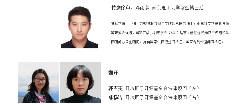开放原子开源基金会的“源译识”开源公益翻译项目以“在共译中凝聚开源共识”为宗旨,对开源相关许可证、域内外司法判决、专业书籍、重点报告等内容进行专业可信的翻译。我们也诚邀广大开源开发者、开源爱好者及翻译爱好者踊跃参与到“源译识”项目中,一起共建可信的多语种开源资料库,促进开源法律全球化交流,为开源社区的稳健发展与国际接轨做出贡献!欢迎您通过translation@openatom.io与我们联系!